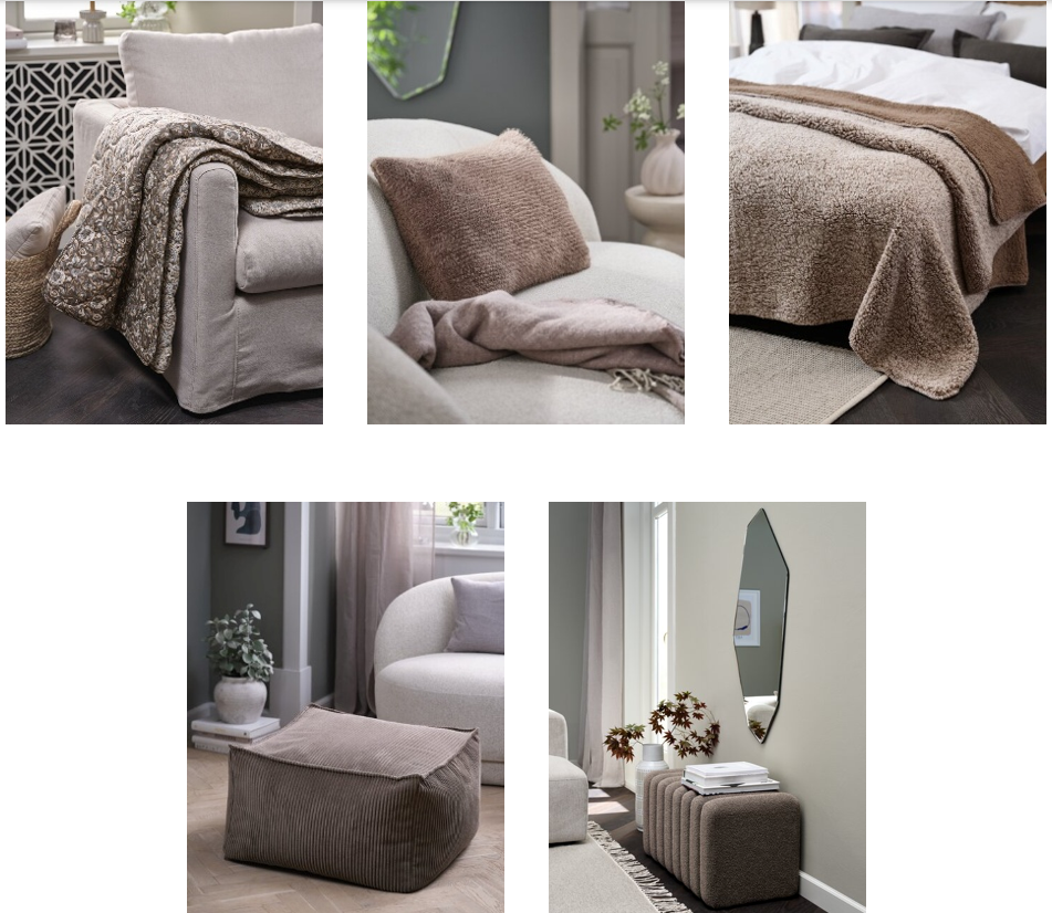 La sensación de hygge suele ir acompañada de mantas acogedoras y cómodos cojines. Los cálidos tonos del otoño se reflejan en la manta ENGKARSE y el cojín VINTEREIK, mientras que la manta de forro polar STORFYRTLE abrigo extra. Los elementos textiles, como el puf AARS o el popular banco BISLEV, añaden comodidad y un toque de encanto a cualquier espacio.