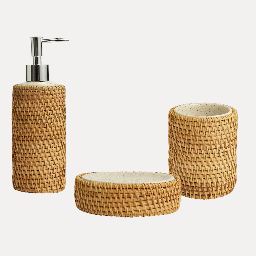 Colección de accesorios de baño de materiales naturales: cerámica y mimbre