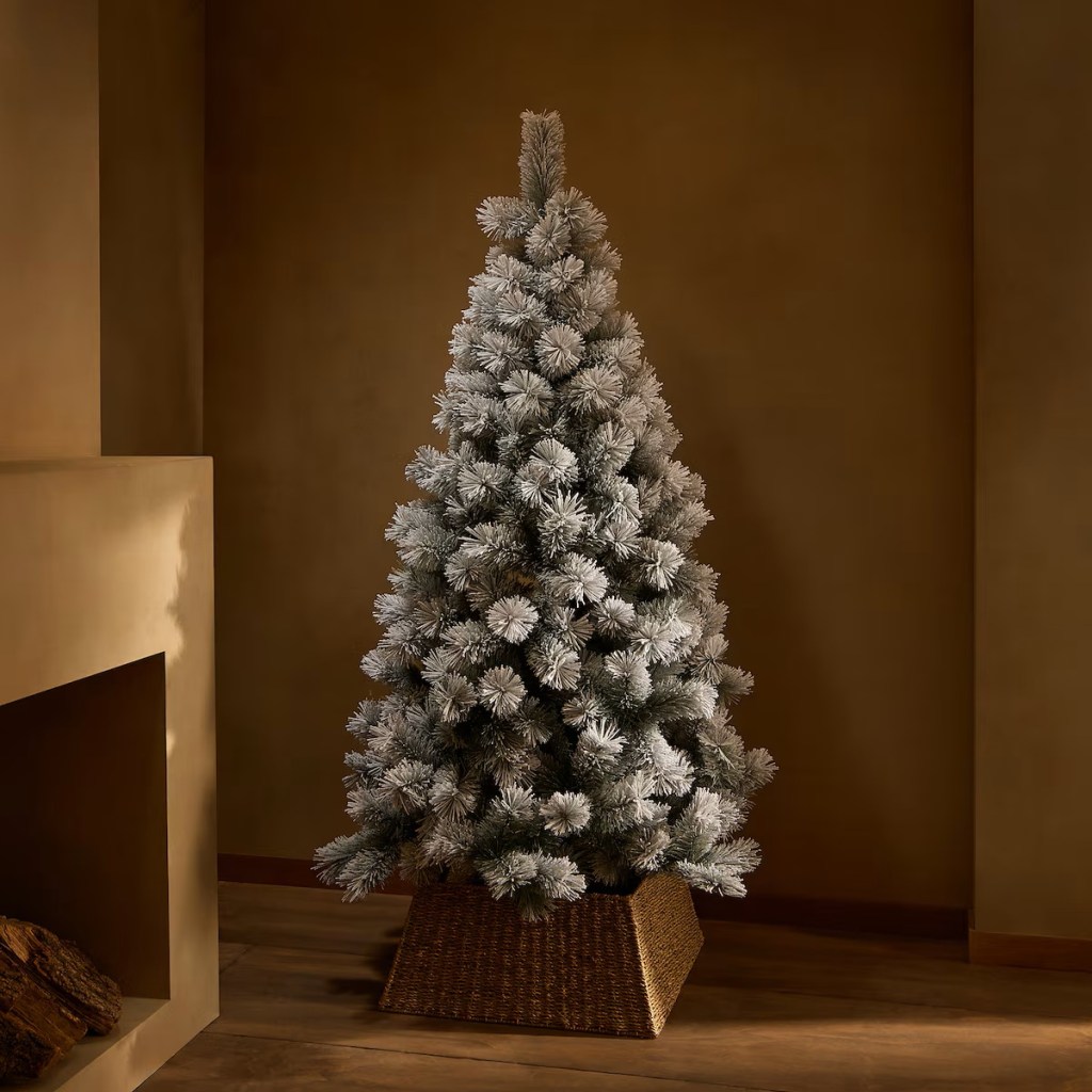 Árbol de suelo nevado Cervinia Navidad es ideal para crear una ambiente invernal y acogedor. Se caracteriza por su frondosidad con ramas gruesas y por su realista efecto nevado. La base o pie de apoyo no suele estar incluida, por lo que necesitarás un faldón, una cesta o un soporte para ocultar la pata y complementar la decoración.