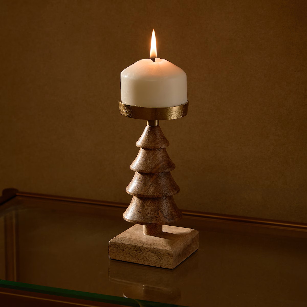 Portavelas de madera árbol Navidad. Este accesorio es ideal para incorporar la tendencia natural a tu decoración. Fabricado en madera, su diseño original aportará un ambiente cálido y navideño a tu hogar. Es un detalle esencial para estas fiestas, perfecto para combinar con decoraciones en dorados y blancos.
