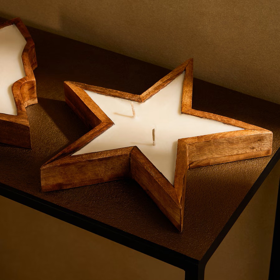 Vela estrella fantasía Navidad. Ideal para centros de mesa o para adornar cualquier rincón con un brillo sutil. Esta vela decorativa con forma de estrella aporta glamour y la elegancia festiva que necesitas. Su diseño es perfecto para complementar la tendencia de decoración en blancos y dorados.