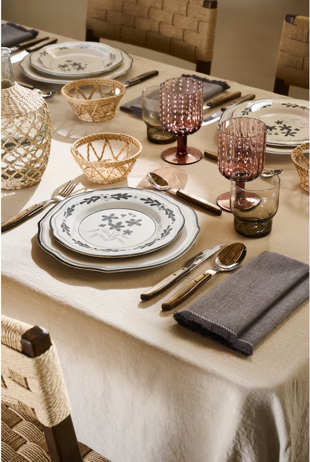 Mantel Lino Room de El Corte Inglés. Para conseguir esa calidez y sofisticación atemporal en tu mesa, comienza por los textiles. Este mantel ofrece un tacto natural y una caída impecable. Disponible en una amplia gama de colores, incluyendo tonos ideales como el verde oscuro (perfecto para la Navidad) o el blanco roto (que complementa con los dorados).