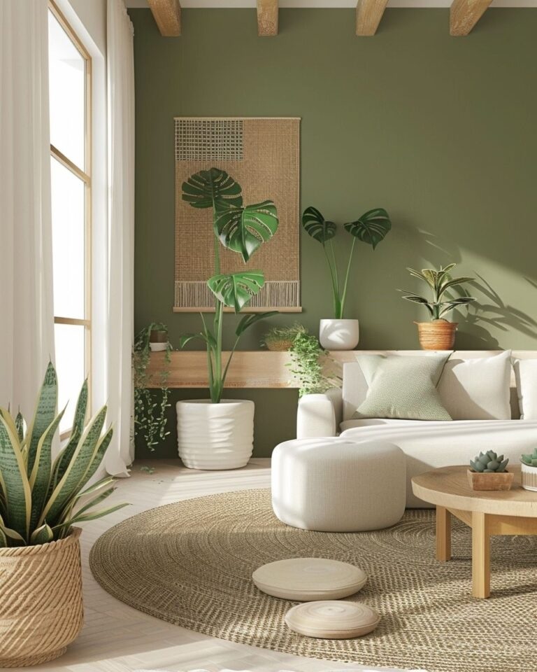 Verde oliva o bosque. Estos tonos establecen una conexión directa con la naturaleza, promoviendo una profunda sensación de calma y renovación. Son ideales para la sala de estar, ya que transforman el espacio en un oasis de tranquilidad y bienestar.