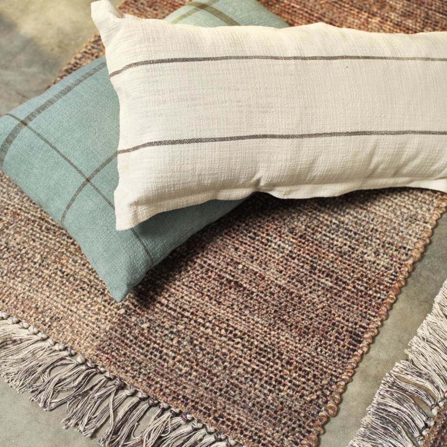 La alfombra ENGSYRE aporta calidez y colores naturales, mientras el cojín KLOKKELYNG suma suavidad extra al sofá. Combínalos con la manta HUMLE en azul petróleo y el cojín HALLON en azul grisáceo para crear un juego cromático elegante.