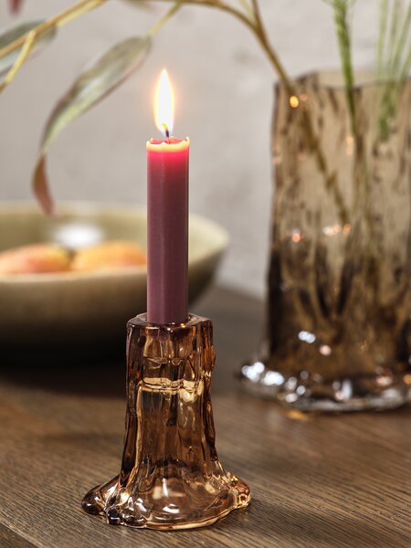 Extiende los tonos tierra por todo el salón con piezas como el jarrón y el candelabro de vidrio OTTO, inspirados en formas orgánicas. Las velas GUDMUND, en tonos berenjena, aportan luz cálida y armonizan la paleta cromática.