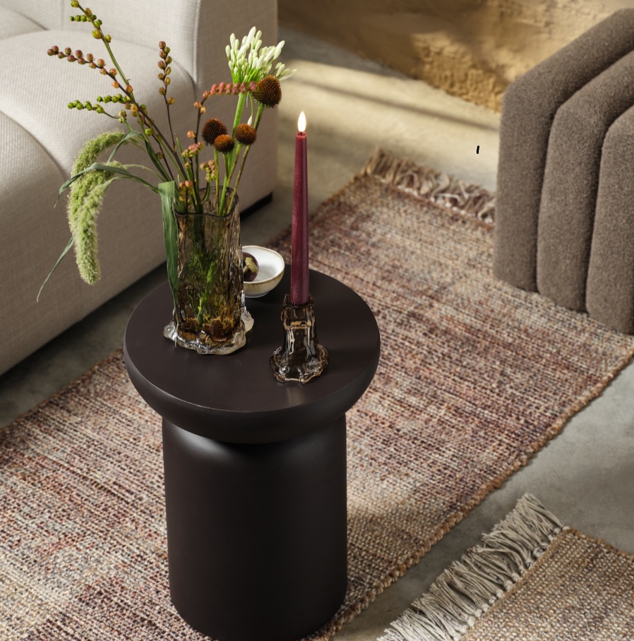 La colección incluye también el portavelas de gres CONRAD, que con su tono claro complementa las velas LED en color berenjena. Además, destacan los jarrones VILHELM (marrón oscuro) y VILMER (en tonos berenjena), piezas únicas que llenan el espacio de personalidad. Para completar, la flor artificial OLA añade un toque botánico que perdura en el tiempo.