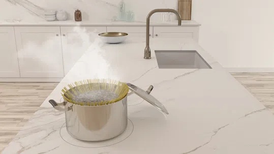 Placas de inducción instaladas bajo encimeras de piedra o cerámica, permitiendo usar la superficie de trabajo como zona de cocción.