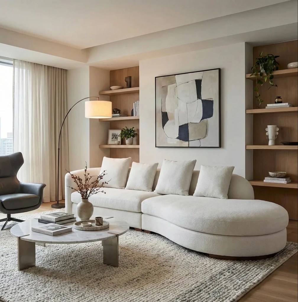 El minimalismo evoluciona hacia una versión mucho más cálida y sensorial en las tendencias deco de 2026. El color del año Pantone Cloud Dancer (blanco suave y etéreo) se convierte en el aliado perfecto para aportar un equilibrio único y ligereza visual. Esta tonalidad es la base ideal para crear atmósferas relajantes, especialmente cuando se combina con la calidez de los tonos arena, piedra y terracota suave, logrando espacios llenos de armonía.