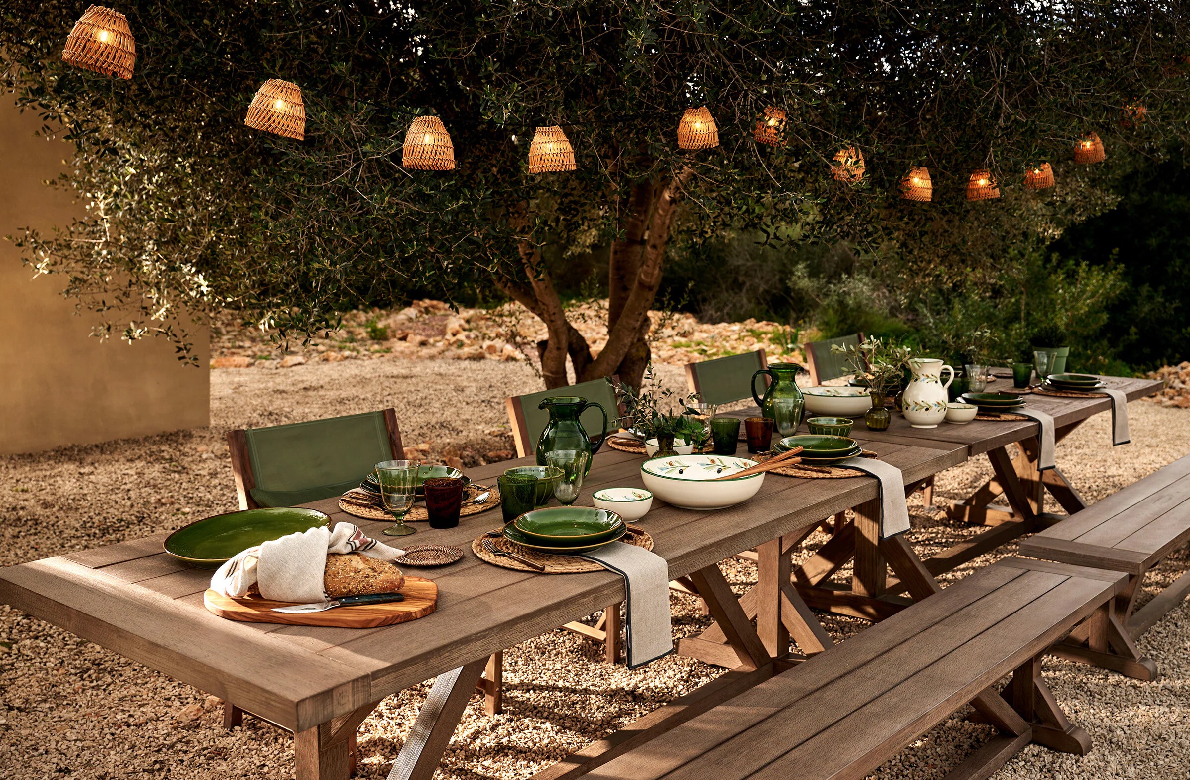 La iluminación es un factor importante en los espacios exteriores para crear un ambiente cálido y festivo en las noches al aire libre. Adquieren un papel protagonista las lámparas portátiles, guirnaldas luminosas y faroles para crear atmósferas envolventes. Por otra parte, los toldos, pérgolas y parasoles técnicos permiten regular la luz solar para protegerse de las horas de mayor intensidad y disfrutar del exterior durante todo el día.